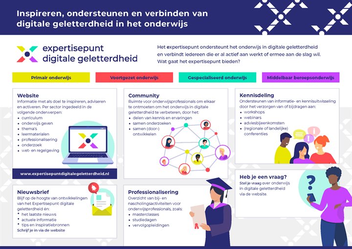 Het Expertisepunt digitale geletterdheid wil het onderwijs op het gebied van digitale geletterdheid in Nederland versterken. Het expertisepunt wordt de verbindende factor voor iedereen die al actief is of aan de slag wil met digitale geletterdheid in het primair-, voortgezet- en gespecialiseerd onderwijs en het middelbaar beroepsonderwijs.Lees verder op: Expertisepunt digitale geletterdheid