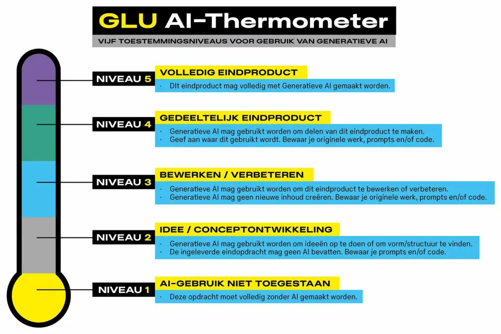 Studenten waren aanvankelijk vaak ambivalent, maar ook dat veranderde. Ze vragen wel om duidelijke kaders: wat mag er met AI  en waar ligt de grens? Een AI-thermometer met meerdere niveaus van toestemming en gebruik geeft deze duidelijkheid.