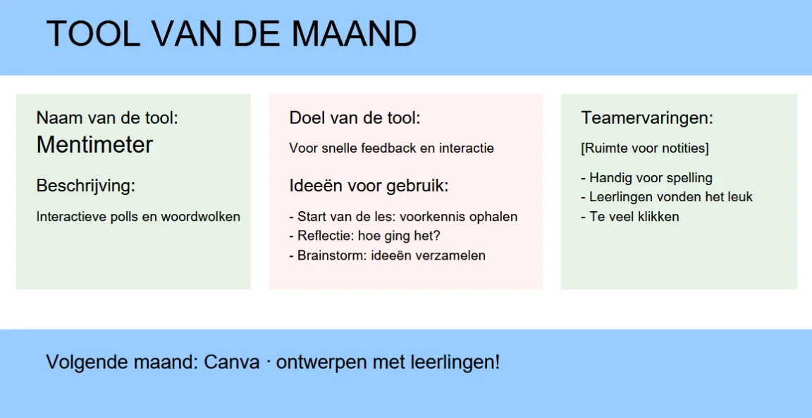 Naast het bord ontstond er nog een mooie manier om kennis te maken met digitale tools: gewoon samen uitproberen tijdens een teamvergadering. Zo startten we een vergadering met Mentimeter: iedereen vulde op zijn telefoon één woord in over hoe hij zich voelt bij digitalisering. Binnen seconden verscheen er een kleurrijke woordwolk op het scherm: “Nieuwsgierig.” “Overweldigd.” “Leuk, maar spannend.” Het werd een gesprekstarter én een voorbeeld van hoe je zo’n tool in de klas kunt gebruiken.